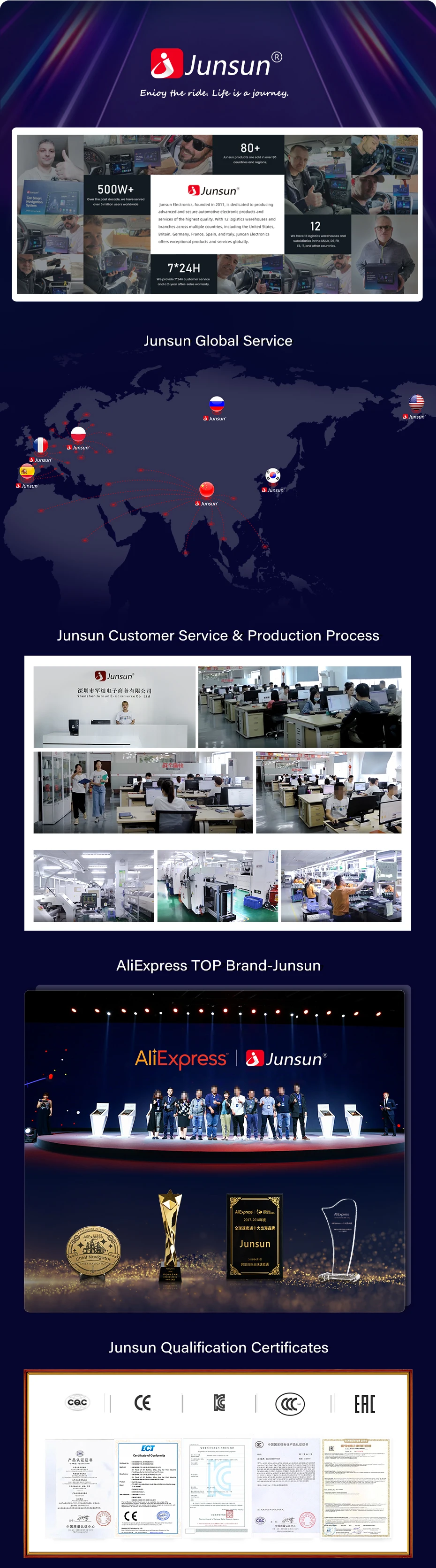 4. Junsun brand introduction:AliExpress Top 10 Brands, Junsun has 2000K+ fans, Over the past decade, we have served over 5 million users worldwide, popular among customers.Our goal is to keep working hard to make innovative hardware & software of the Car Multimedia player radio to give you that personalized experience. We provide updates for Firmware, Software, UI, Navigation maps for FREE.