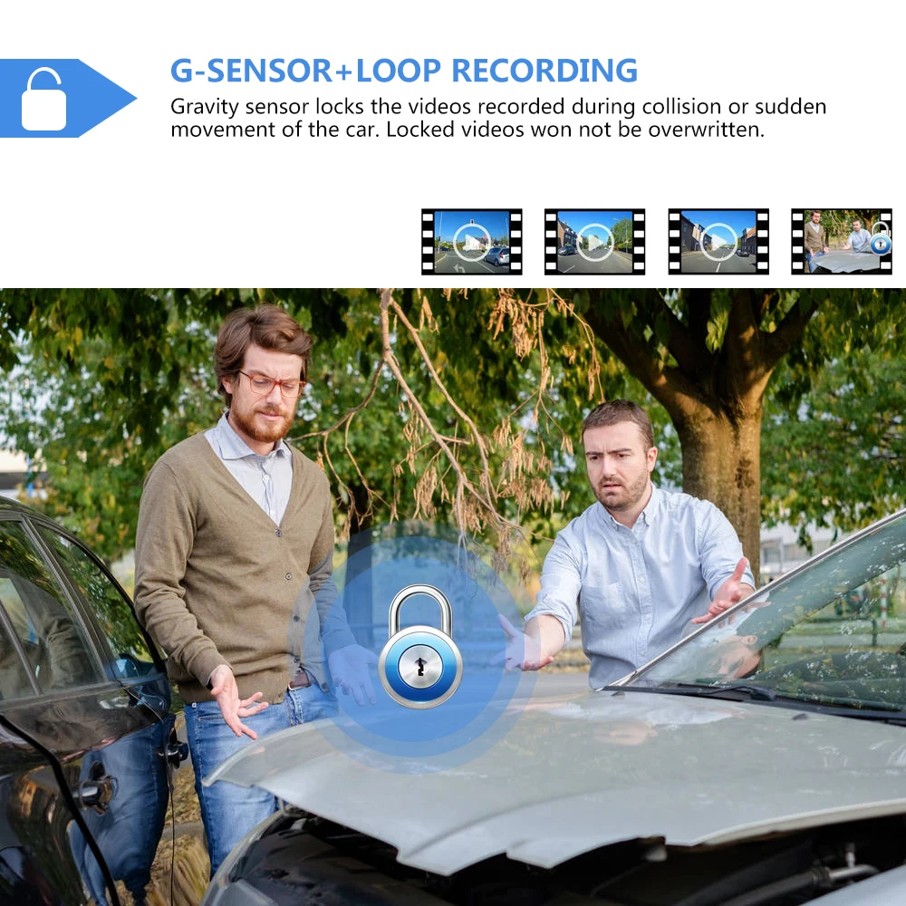 【LOOPING RECORDING & G-SENSOR】The integrated G-sensor will auto-lock recorded video for safekeeping when detecting collision, which makes the video can't be overwritten even Loop Record function is on. When the storage space is full, it can automatically cover the earlier segment. With Loop Recording enabled, you never have to worry about the capacity of our SD card is full (NOT Including SD card).