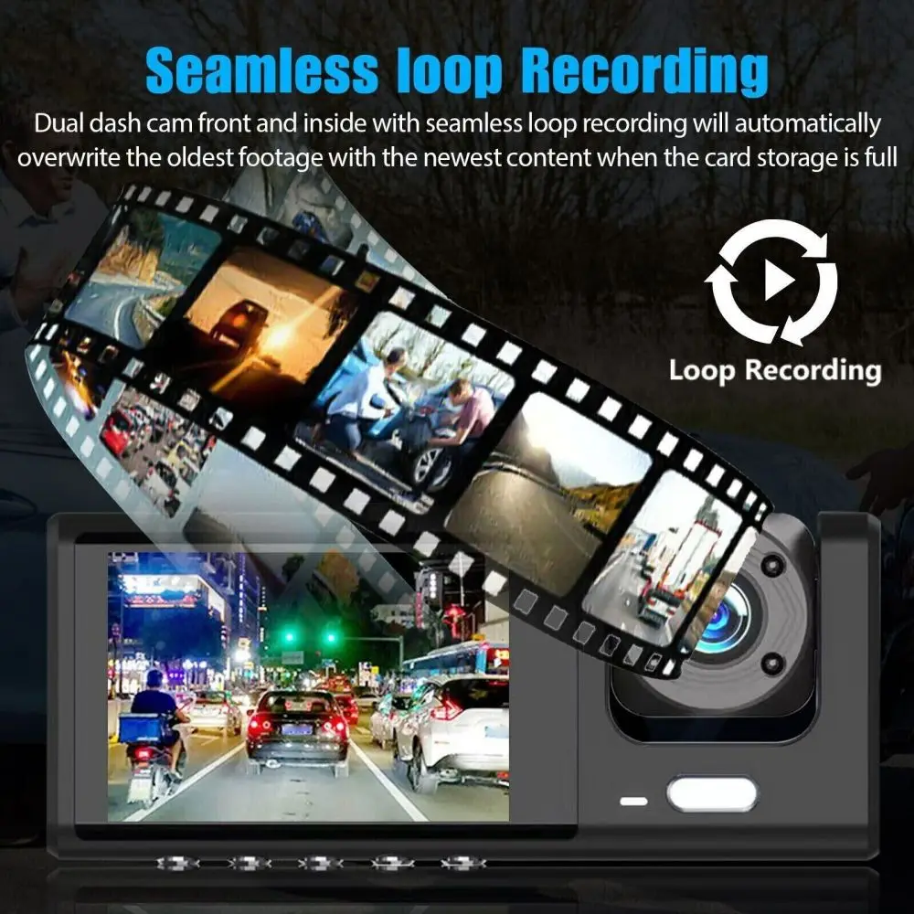 Seamless loop Recording:Dual dash cam front and inside with seamless loop recording will automatically overwrite the oldest footage with the newest content when the card storage is full. You will never worry about the memory card running out of space.